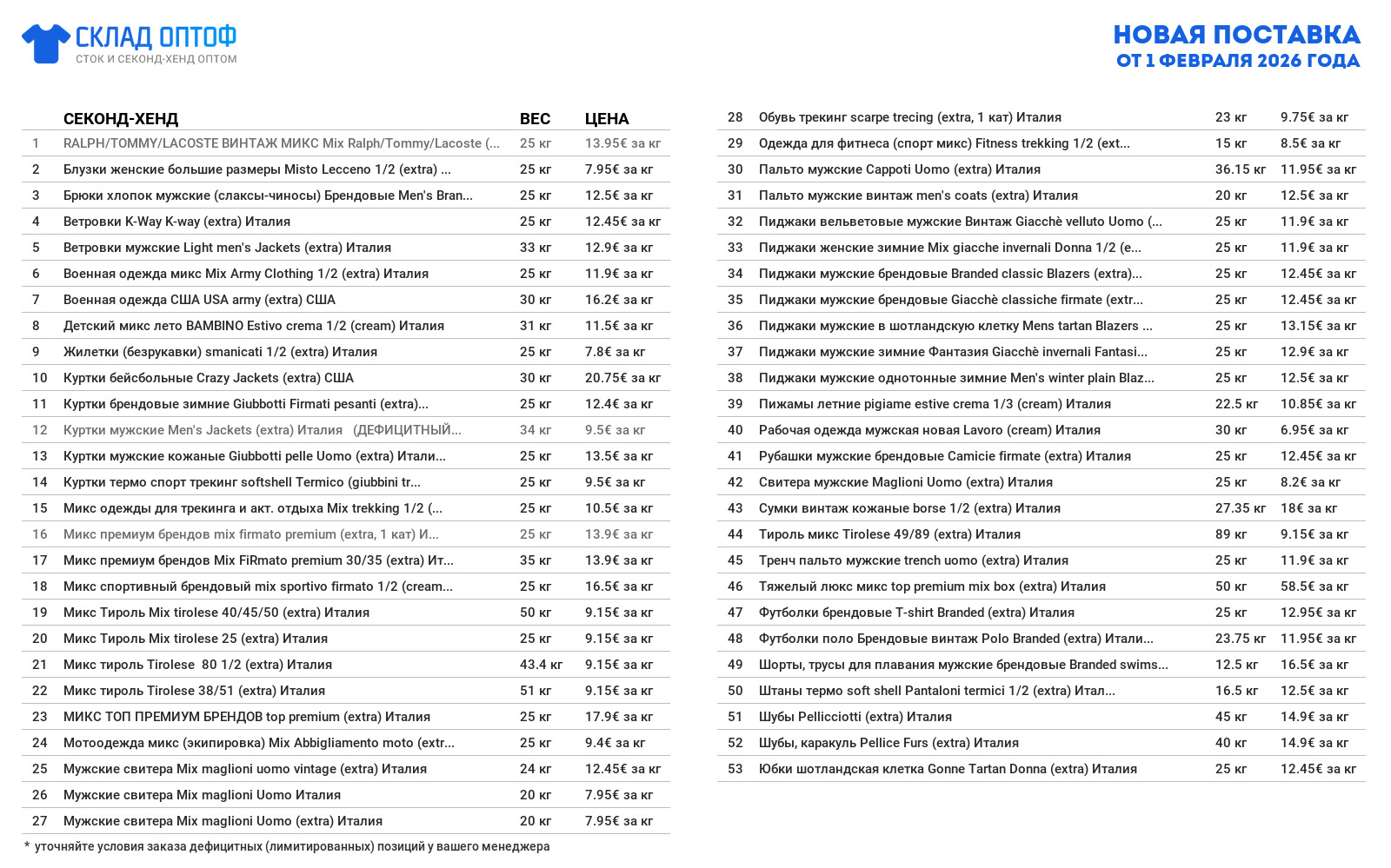 Небольшой привоз из Европы, актуальные позиции на текущий и следующий сезоны. Поторопитесь, привезли немного Что сегодня привезли для вас: Нижнее белье, Пижамы, ночные рубашки, Дом. текстиль, скатерти декоративные, пдо (в основном все новое), Куртки легкие, пуховики весенние, Мотоодежда микс (экипировка) и другое. Наш прайс-лист уже пополнился этими новинками ;)