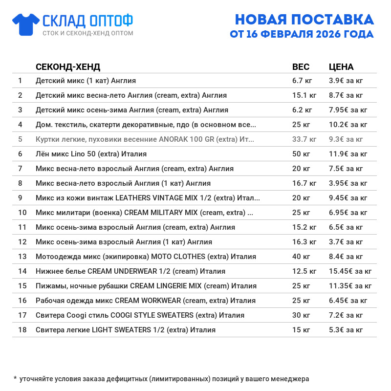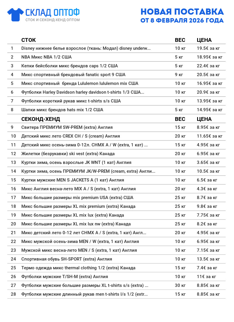ПосмотретьГигантский привоз новинок и популярных у наших клиентов позиций уже на складе! Постарались закупить столько, чтобы хватило всем: более 17000 кг. Новинки, которые сегодня привезли: Жилетки (безрукавки), Штаны мужские карго, Микс Тироль, Лён микс, Обувь трекинг (более 730 мешков). Все новинки уже в прайсе и с доставкой до Кирова!